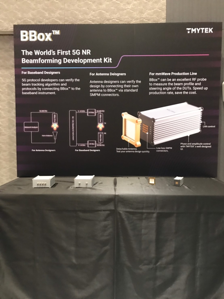 Inside the XBeam chamber, there is a DUT (device-under-test) being tracked. On the right side of the screen shows how the DUT’s beam looks like.The XBeam, AiP and BBox product series become the spotlight of the event. Ethan Lin, Vice president of TMYTEK, demonstrates these major solutions for 5G antenna design and production test. The first live product demonstration is the Beamforming Box (BBox). This is a powerful development tool and design kit for mmWave antennas. The current BBox product series is the third generation design with several different models.