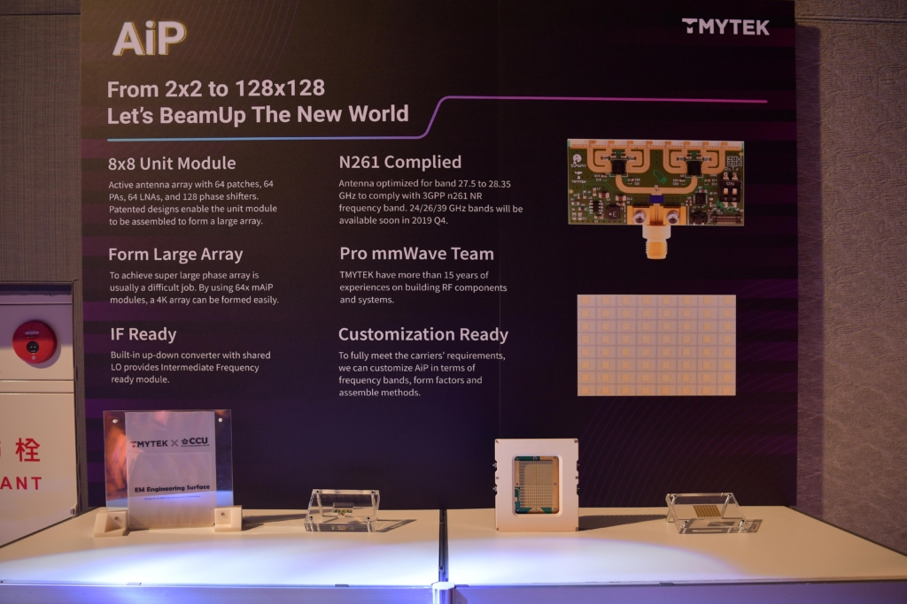 XRifle is the technology to optimize the number of base stations for solving the issues of coverage-constrained base station deployment. with NI USRP, a long-distance real-time mmWave video streaming along with the tracking technology is achieved.There are other products showcasing to gain attention. For example, the XRifle is the technology to optimize the number of base stations for solving the issues of coverage-constrained base station deployment. Lin adds, the concept is using the signal repeater devices to maximize the 5G signal coverage.. Meanwhile, in the semiconductor product showcase, the AiP (Antenna in Package) chip is not only a proof of concept design, it is a funcational prototype and can be used as the base for the future cusomization. This module is an 8×8 antenna arrays. It could be tiled up to form 4K antenna arrays in theory. These product demonstrations have successfully show TMYTEK technical strength of 5G antenna arrays and test solutions to Taiwan technical sectors.
